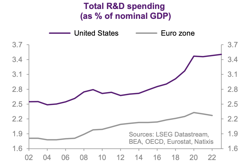 De geringe investeringen in nieuwe technologieën en O&O-uitgaven. (Bron: Natixis Bank)