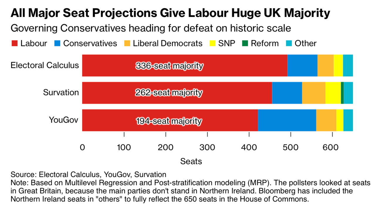De Britse Conservatieven (blauw) stevenen af op een historische nederlaag in de vervroegde verkiezingen van 4 juli aanstaande.
