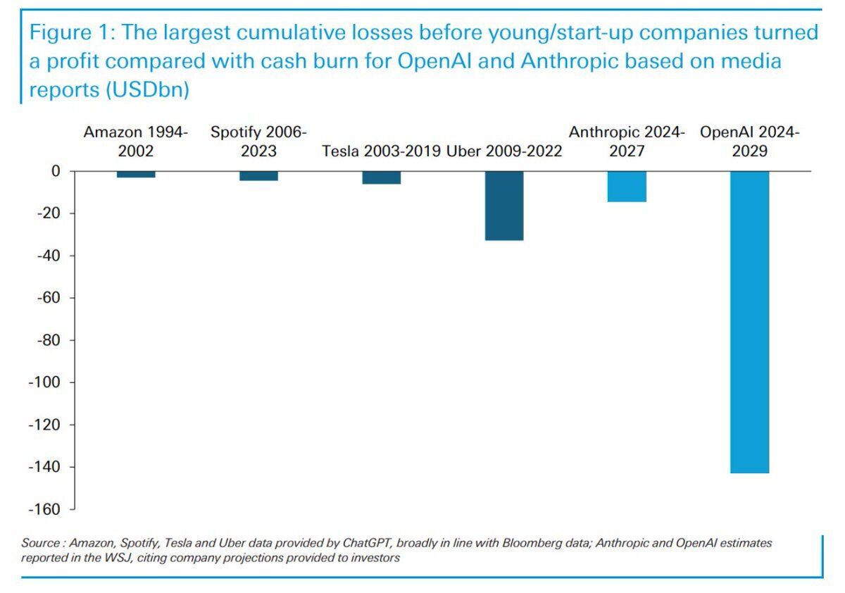 Op dit moment verbrandt OpenAI geld in een ongelooflijk tempo — veel sneller dan de meest spilzuchtige startups uit eerdere techbubbels 👇. Een deel van die uitgaven wordt gefinancierd door de verkoop van OpenAI-aandelen. Veel wordt gefinancierd met schulden. Hoe gaat OpenAI dat allemaal terugbetalen? Het heeft niet alleen omzet nodig; het moet operationele winstmaken. Als de dagelijkse activiteiten niet winstgevend genoeg worden, kan het zijn schulden niet aflossen en gaat het failliet. Momenteel maakt OpenAI een operationeel verlies, net als concurrenten zoals Anthropic.” (Bron: Noahpinion)