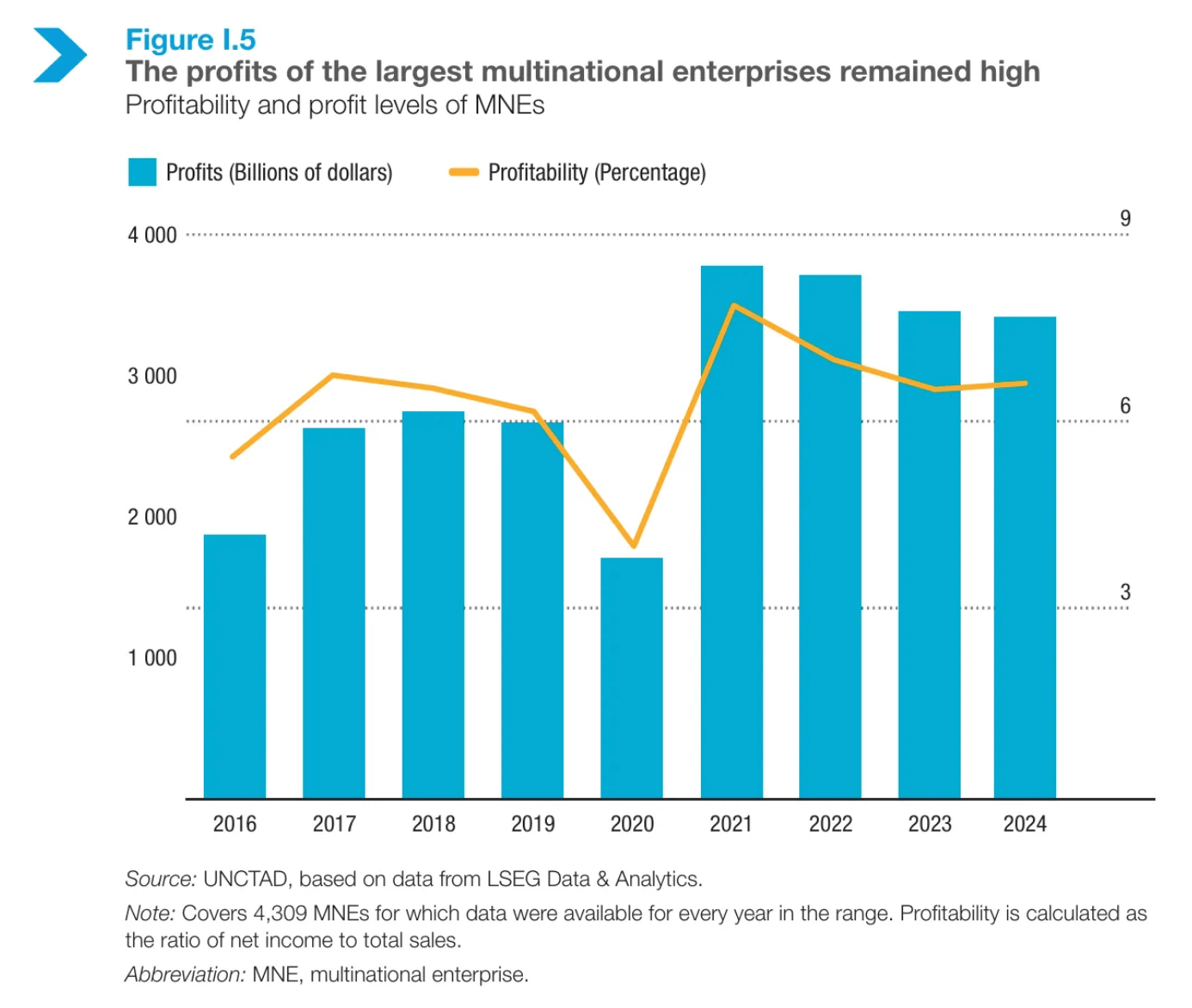De UNCTAD volgt 4.309 multinationals die samen 3.500 miljard dollar winst maken. Gezamenlijk is dat een stijging van 500 miljard dollar in totale winst ten opzichte van de periode vóór COVID. Het rapport staat hier