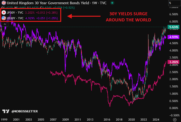 De rente op staatsobligaties stijgt wereldwijd fors: in Japan brak de 30-jaarsrente voor het eerst door 3,2%, terwijl de VS richting 5% gaat en het VK al boven 5% staat. 👇 Dit wijst op groeiende zorgen over overheidstekorten. Tegelijk piekt goud: +30% sinds begin dit jaar, driemaal het rendement van de S&P 500. De stijging komt terwijl de Fed renteverlagingen overweegt ondanks dat de inflatie boven de 3% blijft. Volgens analisten is dit abnormale prijsvorming en bevestigt het gouds status als veilige haven. Beleggers die sinds mei goud kochten, realiseren nu al forse winsten. (Bron: Kobeissi Letter)