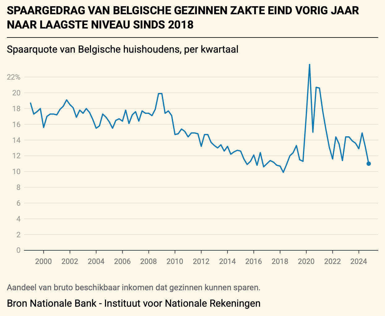 Met een spaarquote van 11 procent, gevoelig lager dan het Europese gemiddelde, tekent het jaareinde van 2024 voor het laagste cijfers sinds midden 2018. Over heel 2024 ligt de spaarquote op 13 procent van het inkomen. Dat is 1,1 procentpunt minder dan het jaar daarvoor, maar iets meer dan in 2022 👇. Volgens de Nationale Bank wordt de krimp van de spaarquote veroorzaakt door een aanzienlijke daling van het beschikbaar inkomen enerzijds en een toename van de consumptie anderzijds. (Bron: De Tijd)