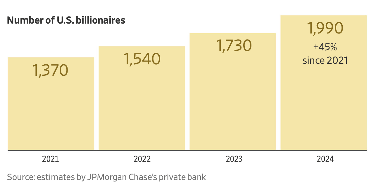 Volgens gegevens van JP Morgan steeg het aantal Amerikaanse nominale miljardairs tussen 2021 en eind 2024 met 45% tot 1.990 👇. Volgens een analyse van Gabriel Zucman (University of California en Paris School of Economics) controleren de 19 rijkst Amerikaanse huishoudens 1,81% van de Amerikaanse rijkdom, tegenover 0.9% in 2000. In één jaar tijd, tegen het einde van 2024, is het aandeel van de moderne 0,00001% - die 19 huishoudens - in het totale vermogen van de Amerikaanse huishoudens gestegen tot 1,8%, of ongeveer $ 2.600 miljard. (Bron: Wall Street Journal)