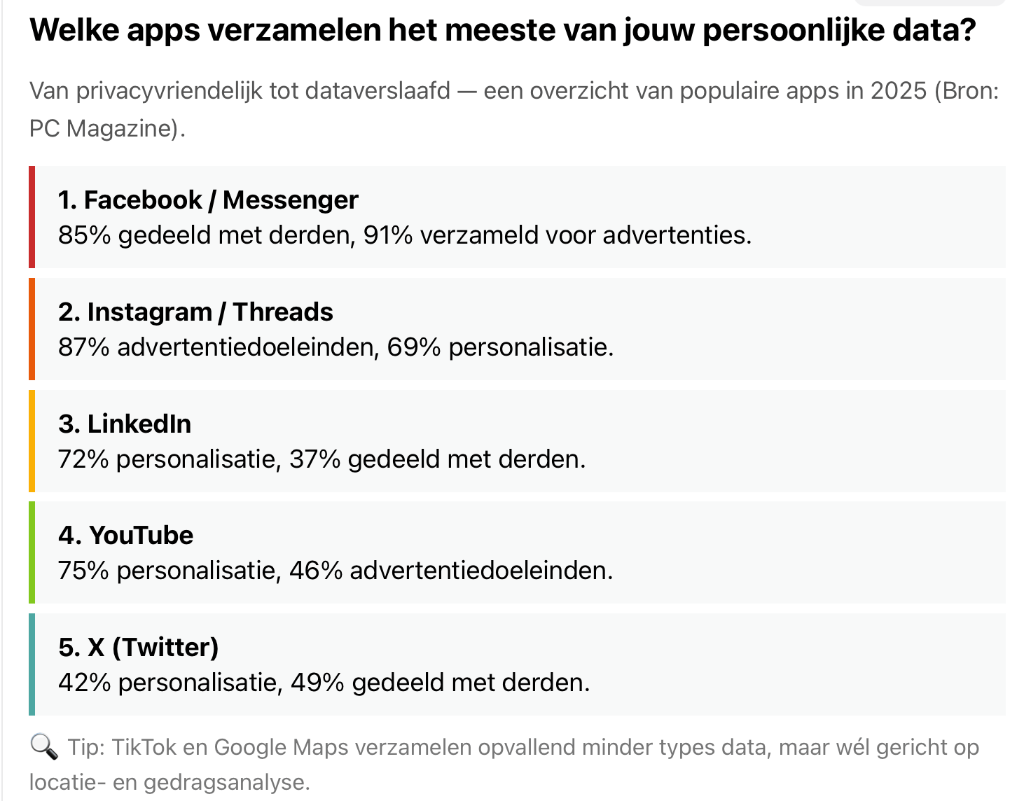 Meta (met Facebook en Instagram) fungeert als een echte datastofzuiger: beide platforms verzamelen en delen meer dan 85% van alle mogelijke gebruikersgegevens voor advertenties, analyse, personalisatie en andere doeleinden. Hun hele bedrijfsmodel draait rond advertentie-inkomsten, waarbij zelfs elke scroll, like of video-pauze wordt geregistreerd. 👇