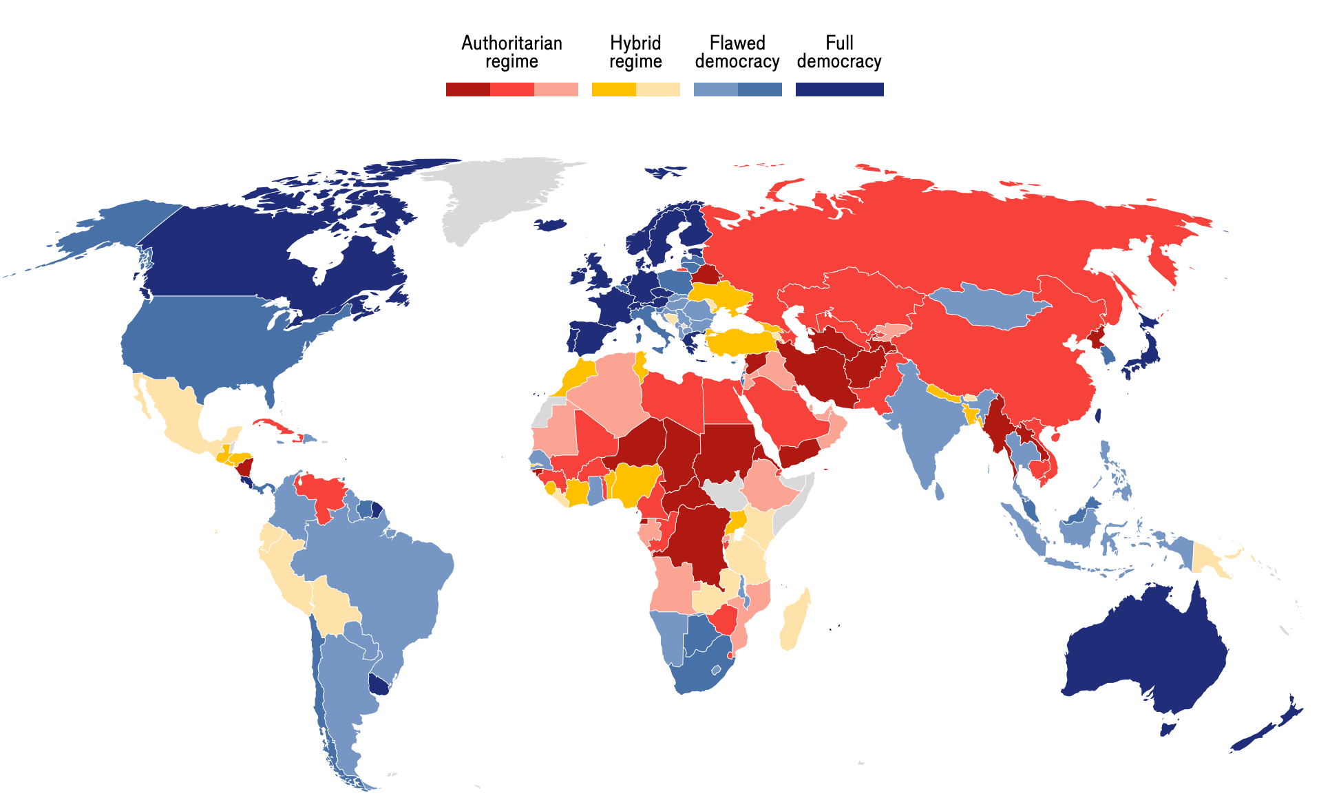 3) Mopperen over de gezondheid van de democratie kan abstract klinken. Maar haar achteruitgang wordt zichtbaar in oorlogen, staatsgrepen, betwiste verkiezingen en beperkingen van burgerlijke vrijheden overal ter wereld. De Economist Intelligence Unit (EIU) volgt die neerwaartse trend al sinds 2006. Maar de recentste update van haar democratie-index wijst op een bescheiden breuk met die trend: in bijna driekwart van de landen bleven de scores het voorbije jaar stabiel of gingen ze erop vooruit, en de wereldwijde index steeg met 0,02 punt — een van de grootste toenames sinds 2012. Noorwegen blijft het meest democratische land ter wereld – een positie die het al zestien jaar bekleedt. Nieuw-Zeeland staat op de tweede plaats; de volgende vier plaatsen worden ingenomen door de andere Scandinavische landen. België scoort in de index op een 31e plek en wordt als een ‘flawed democracy’ bestempeld 👇. (Bron: The Economist)